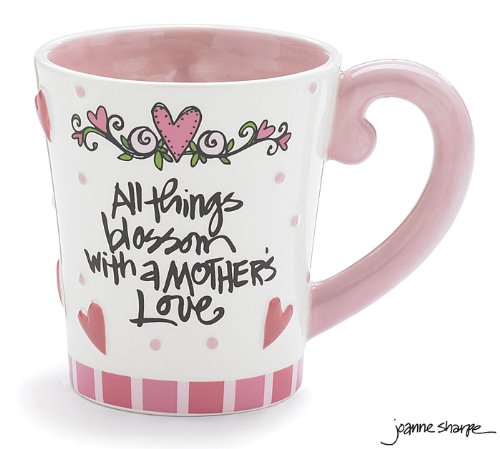 - Ceramic white mug with pink flower heart design with message: "All things blossom with a Mother's love".